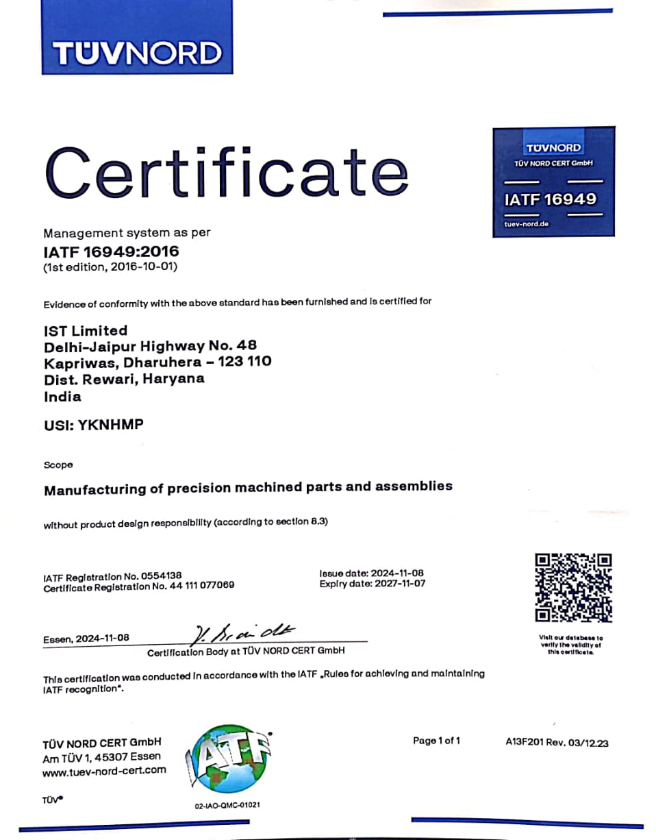 ISO 14001: 2015, ISO 9001: 2015, ISO 45001: 2008 and IATF 16949: 2016 certified unit (through RWTUV NORD, Germany)